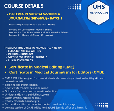MBBS, BDS graduates in field of Allied Health Sciences, Nursing, Pharmacy, and Physiotherapy can apply. Preference is given to candidates working in research or medical journals.