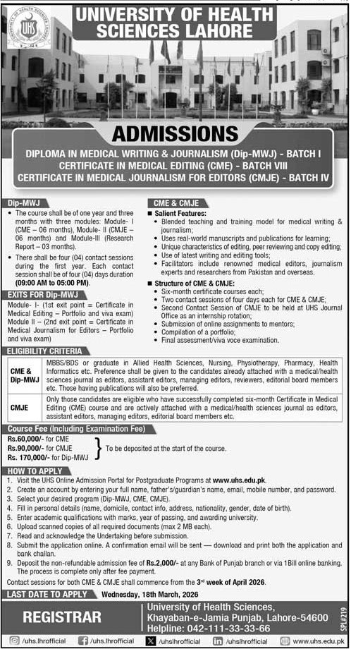 Latest Admission in University of Health Sciences (UHS) Lahore 2026