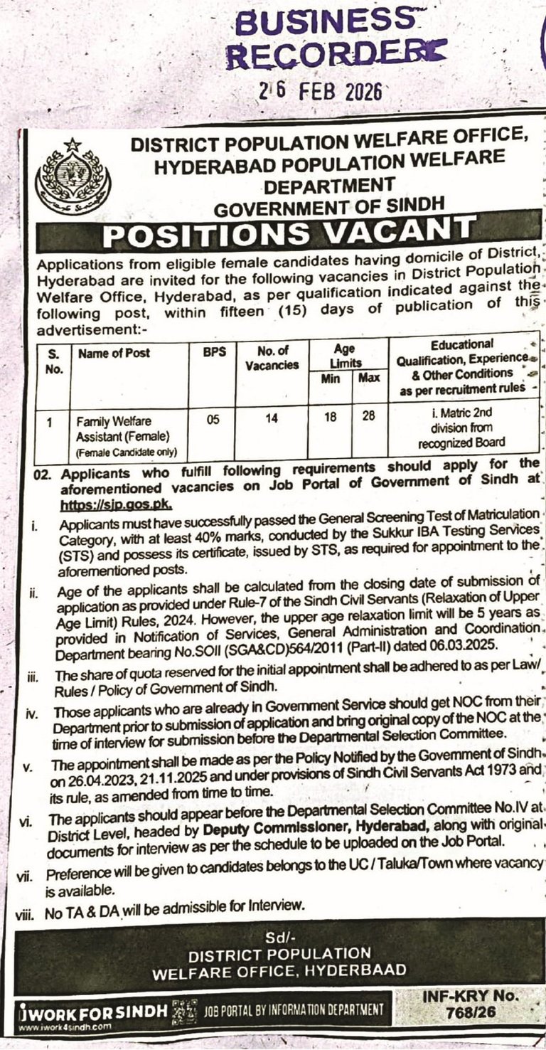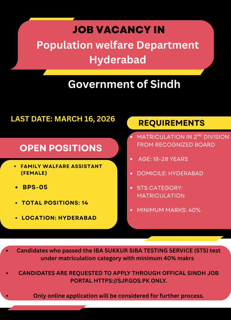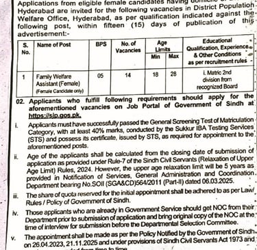 The department has announced new job openings for female candidates in Sindh who are domicile holders of Hyderabad are requested to apply for the Family Welfare Assistant (BPS-05) who meet the criteria i.e. age limit, qualification as announced by the employer are encouraged to apply. This is a career growth opportunity for those individuals who are seeking a stable career in government sector. Candidates are requested to review all the conditions carefully before applying.