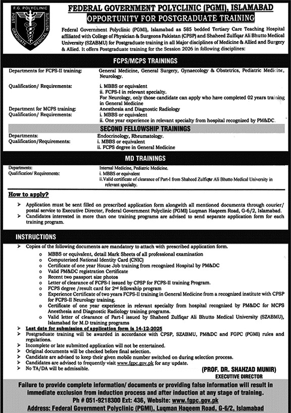 Federal Government Polyclinic Islamabad Postgraduate Training Program November 2025 December PGMI