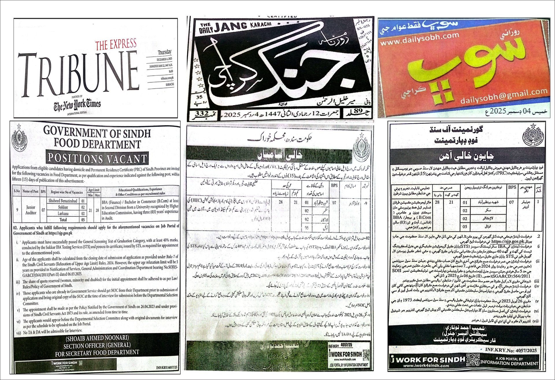 Government of Sindh Food Department Latest Jobs News Papers Sobh, Jung & Tribune 04-12-2025
