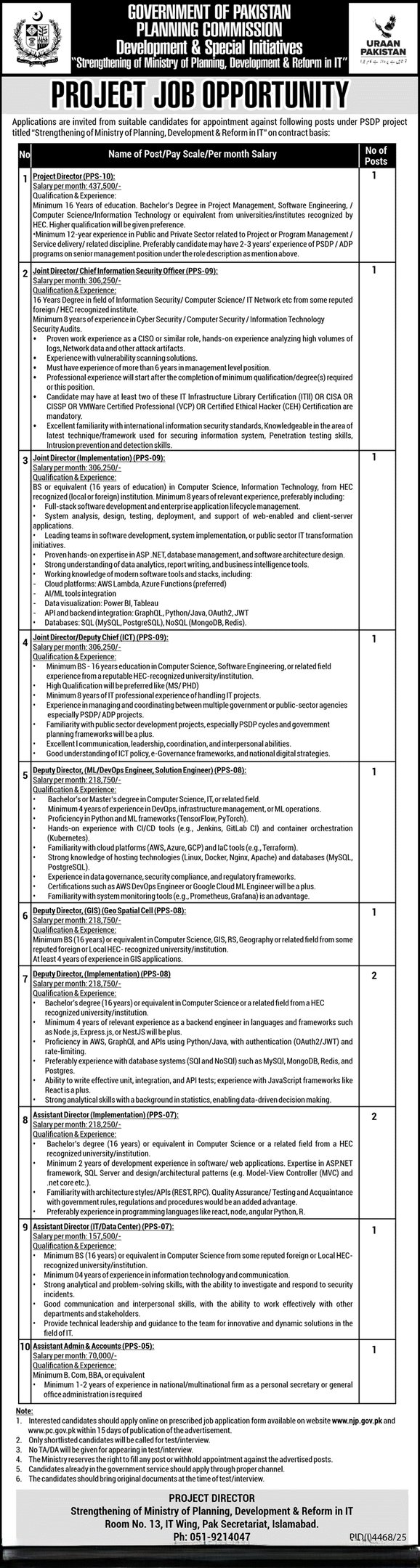 Assistant Director Jobs in Ministry of Planning Development and Reform 2025 November / December Islamabad Pakistan