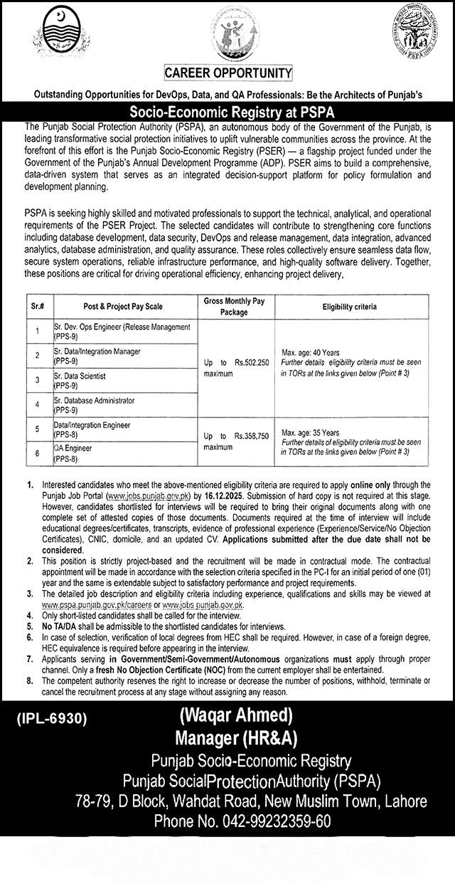 Punjab Social Protection Authority Jobs November 2025 December Apply Online Socio Economic Registry PSPA Latest 30-Nov-2025 (Sunday) in Nawa-i-Waqt