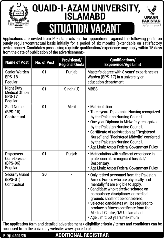 Quaid i Azam University Islamabad Security Guard Jobs November 2025 December