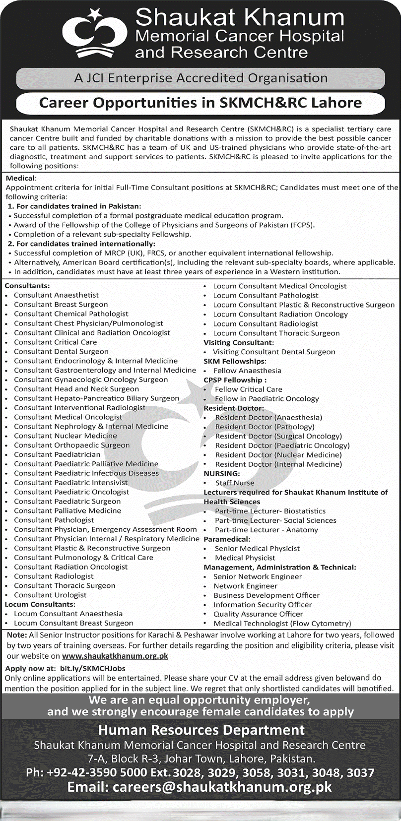 Shaukat Khanum Hospital Lahore Jobs Medical Consultants, Resident Doctors & Others Latest December 2025