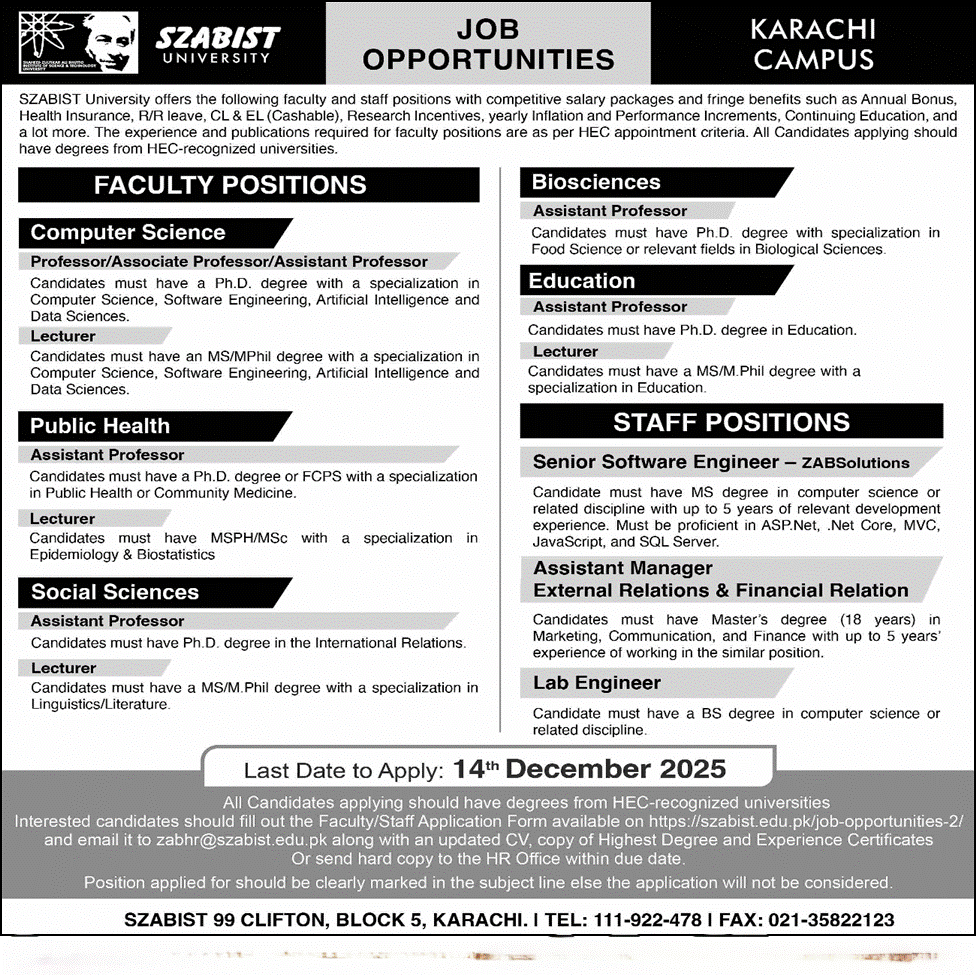 SZABIST University Karachi Jobs November 2025 December Application Form Teaching Faculty & Others Latest