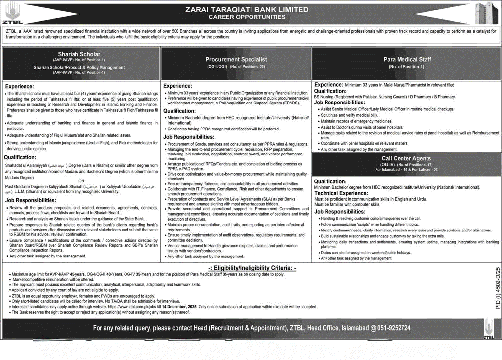 ZTBL Jobs November 2025 December Apply Online Call Center Agents & Others Zarai Taraqiati Bank Limited